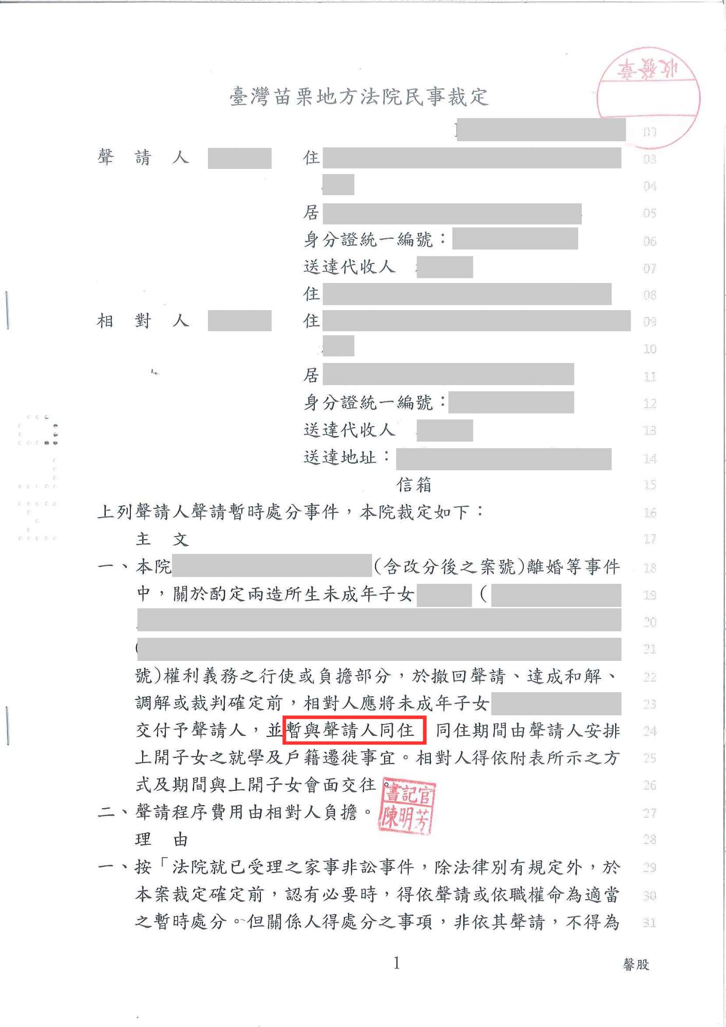 所幸透過與律師的默契合作,協助準備相關證據,並諸多證明老公的惡意拐帶行為後讓對方敗訴,幫助委託人在離婚官司期間請對方將小孩交回,讓委託人能順利和小孩相處過日。
