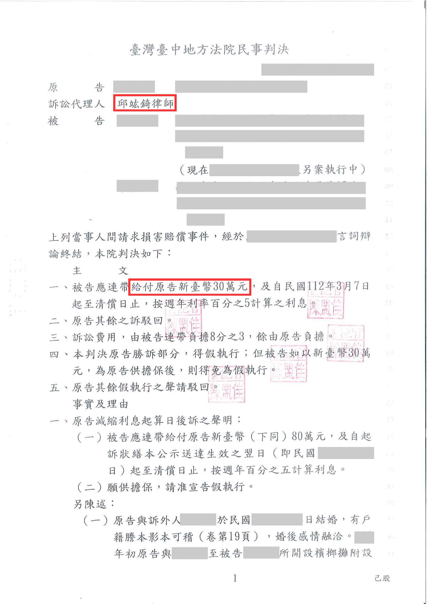 法院是保障良善人民的最後一道防線,但在上法院前,都是有機會透過專業的協商顧問及專業的民事庭家事律師的協助,先讓雙方取得共識並和解,減少因興訟而衍生的費用,還能爭取到高於法院判決的損害賠償金及剩餘財產分配。