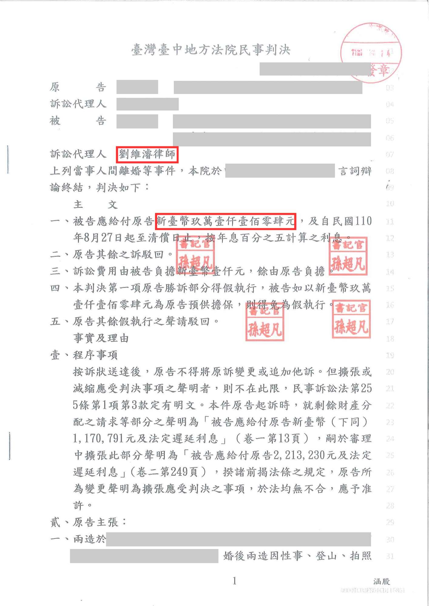 案主先生因外遇離家自行分居並偽造了一份有案主簽名的離婚協議書,辯稱雙方早已有離婚共識,連同許多對我方案主不實的指控跟斷章取義的訊息當證據向法院提出離婚訴訟、請求財產分配近兩百萬元。