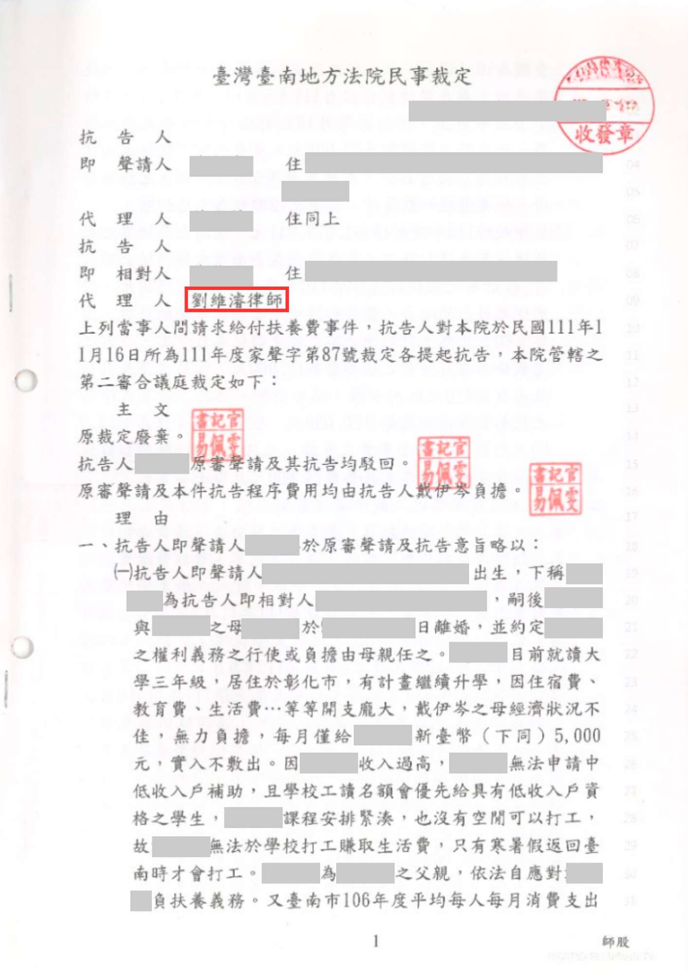 此案較為特殊的地方是我方當事人被「已成年」子女請求給付扶養費至大學畢業,案主認為自己先前都有按時給付扶養費到子女已年滿20歲了,實無理由再向他索取任何費用,法院也不可能會再同意對方的聲請,所以自信滿滿的決定自行處理即可。
