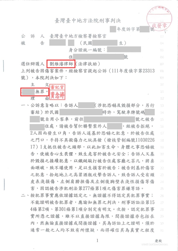 傷害案件成功獲法院無罪判決