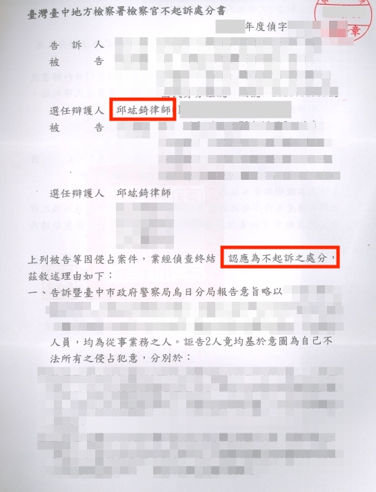 侵占案件獲地檢署不起訴處分