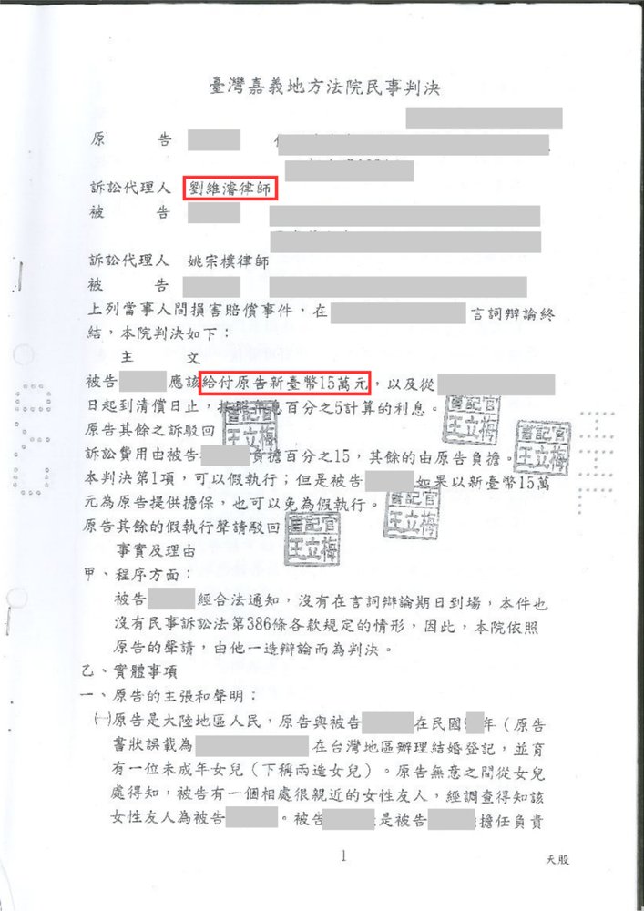 侵害配偶權勝訴,獲賠15萬元