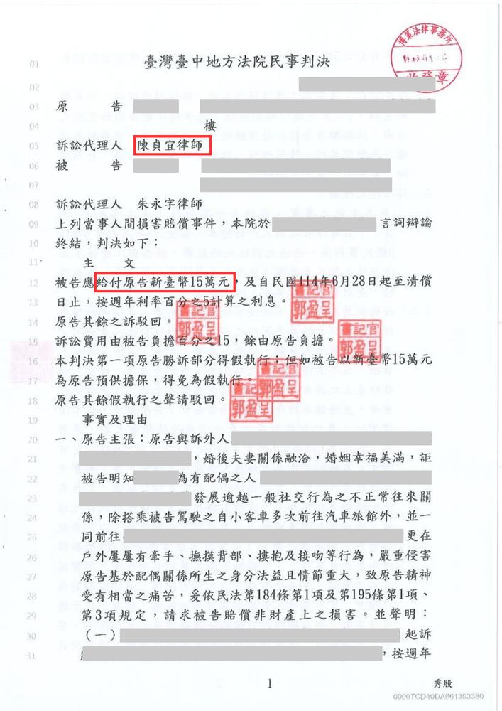 侵害配偶權勝訴,獲賠15萬元