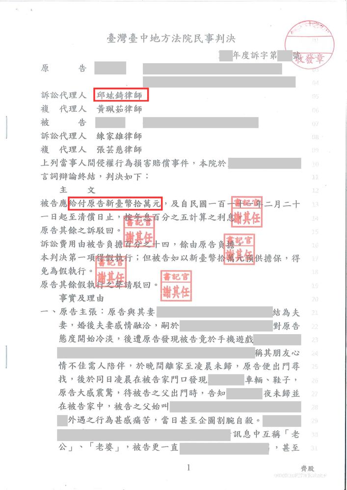 侵害配偶權勝訴,獲賠10萬元