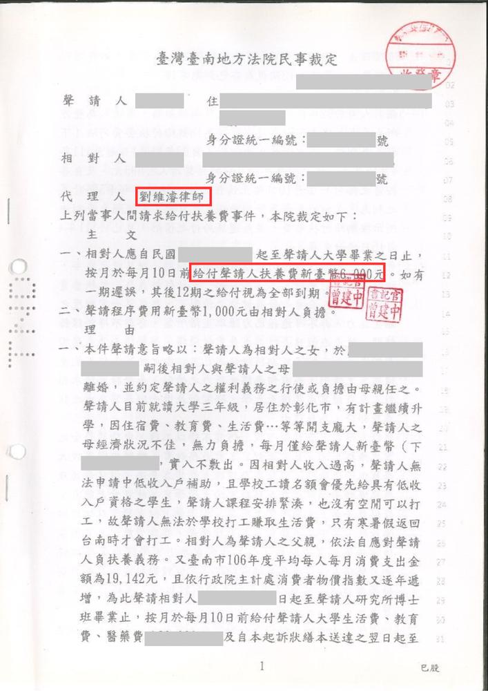 成功爭取子女扶養費每月6000元